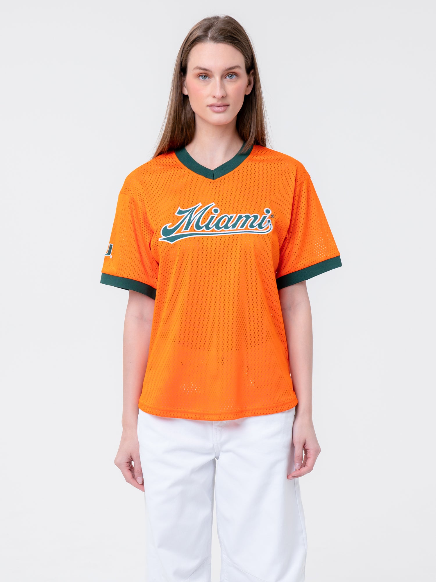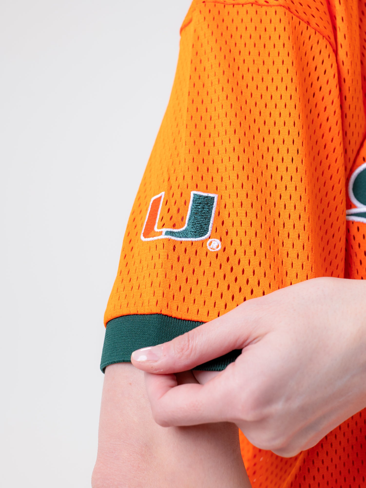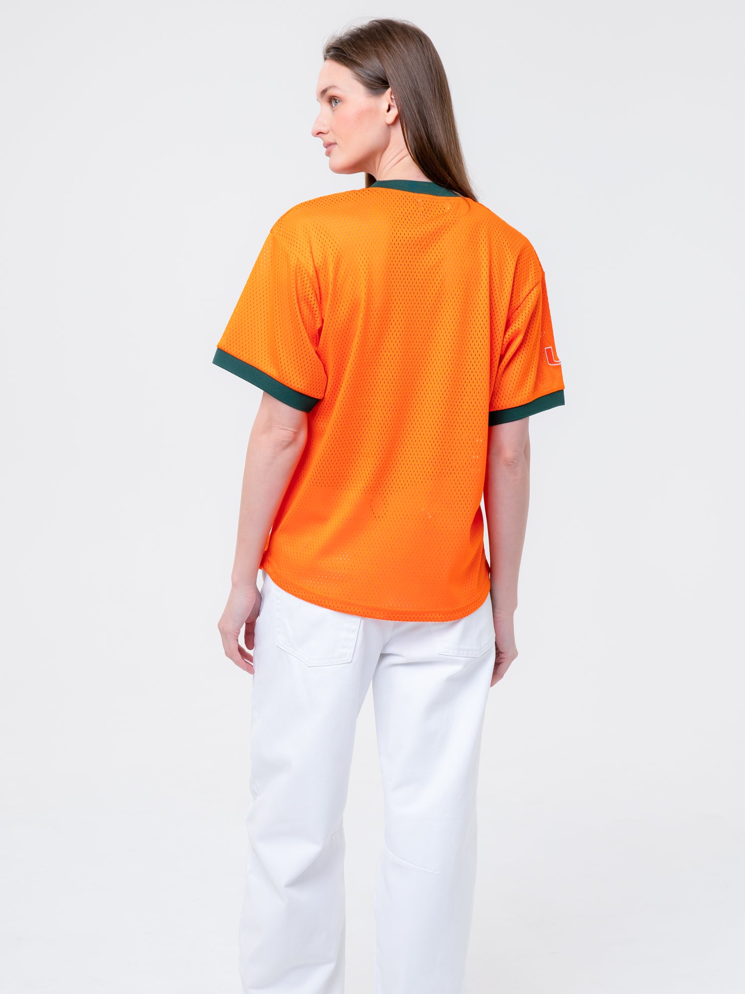 Celebrate game day in bold hurricane style with the University of Miami Full Length Mesh Pullover Jersey by Established & Co. Designed in vibrant orange with tackle twill “Miami”, this jersey brings school spirit to life with a fashion-forward twist. Crafted from lightweight, breathable small-hole mesh, it offers a fit that's perfect for stadium days or layered streetwear looks.