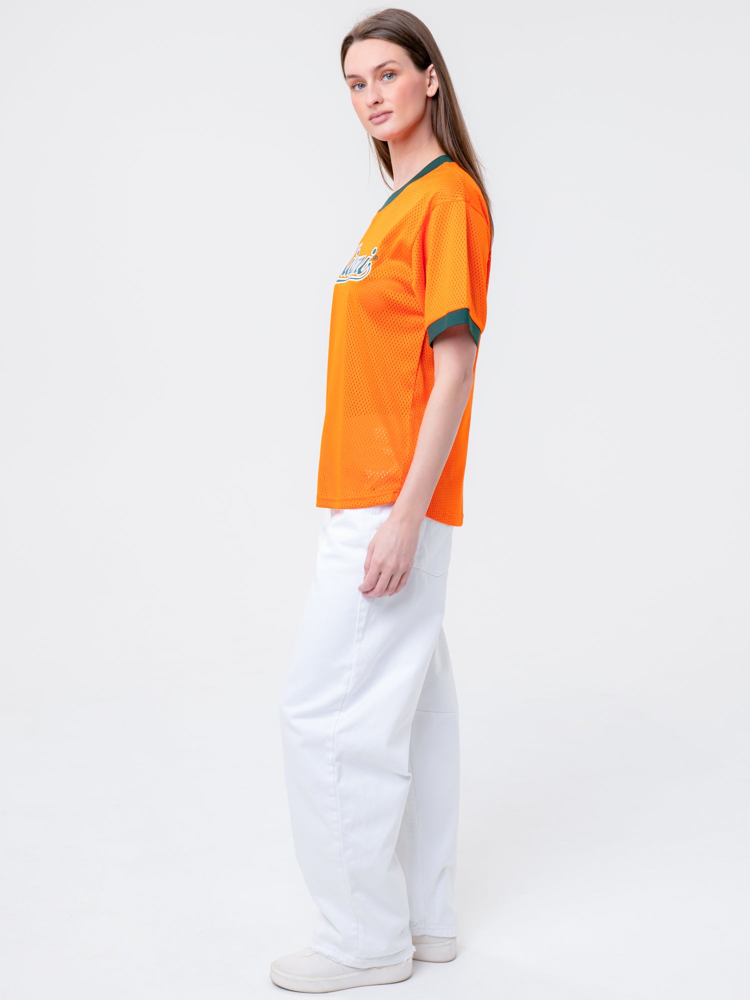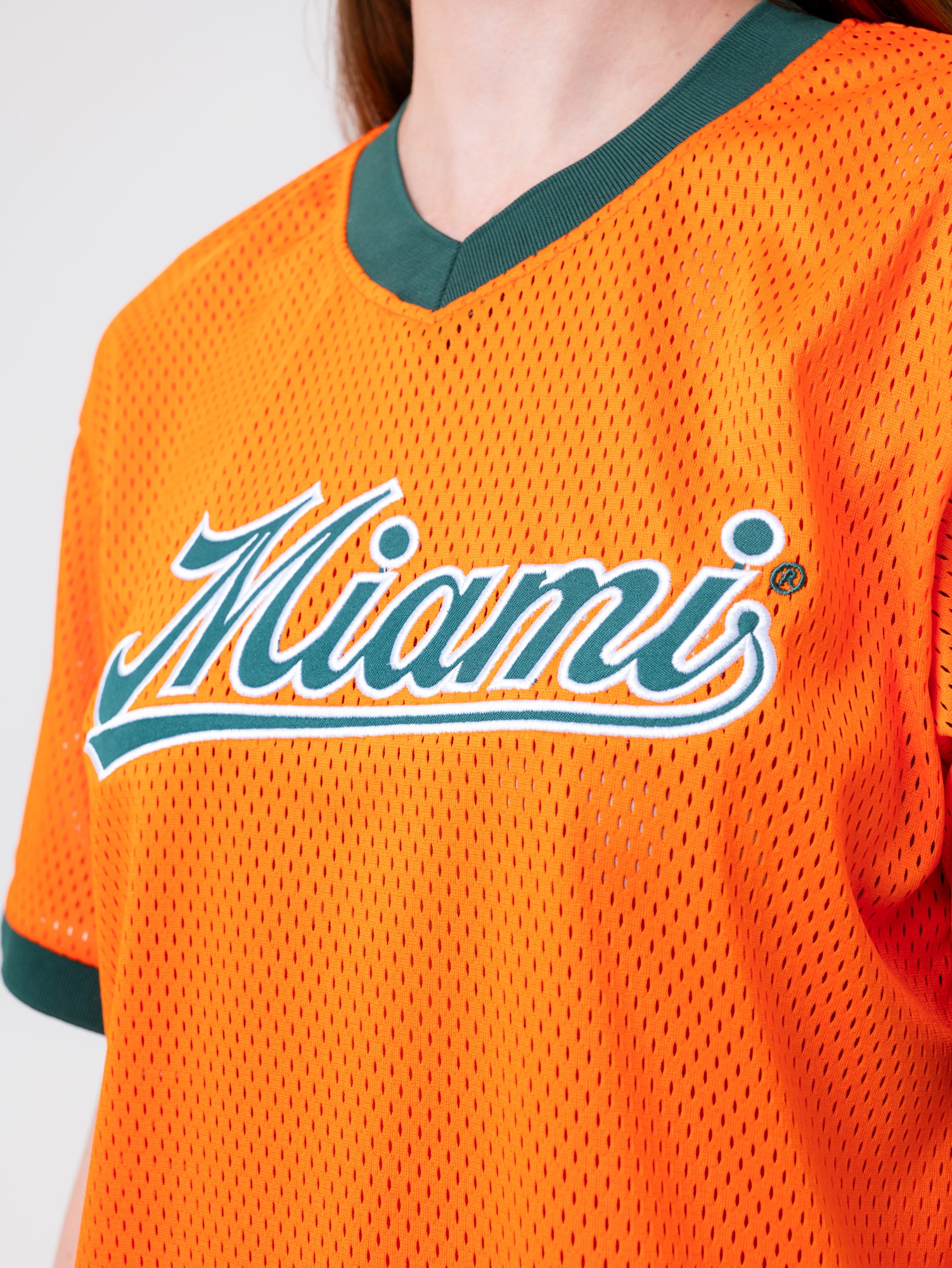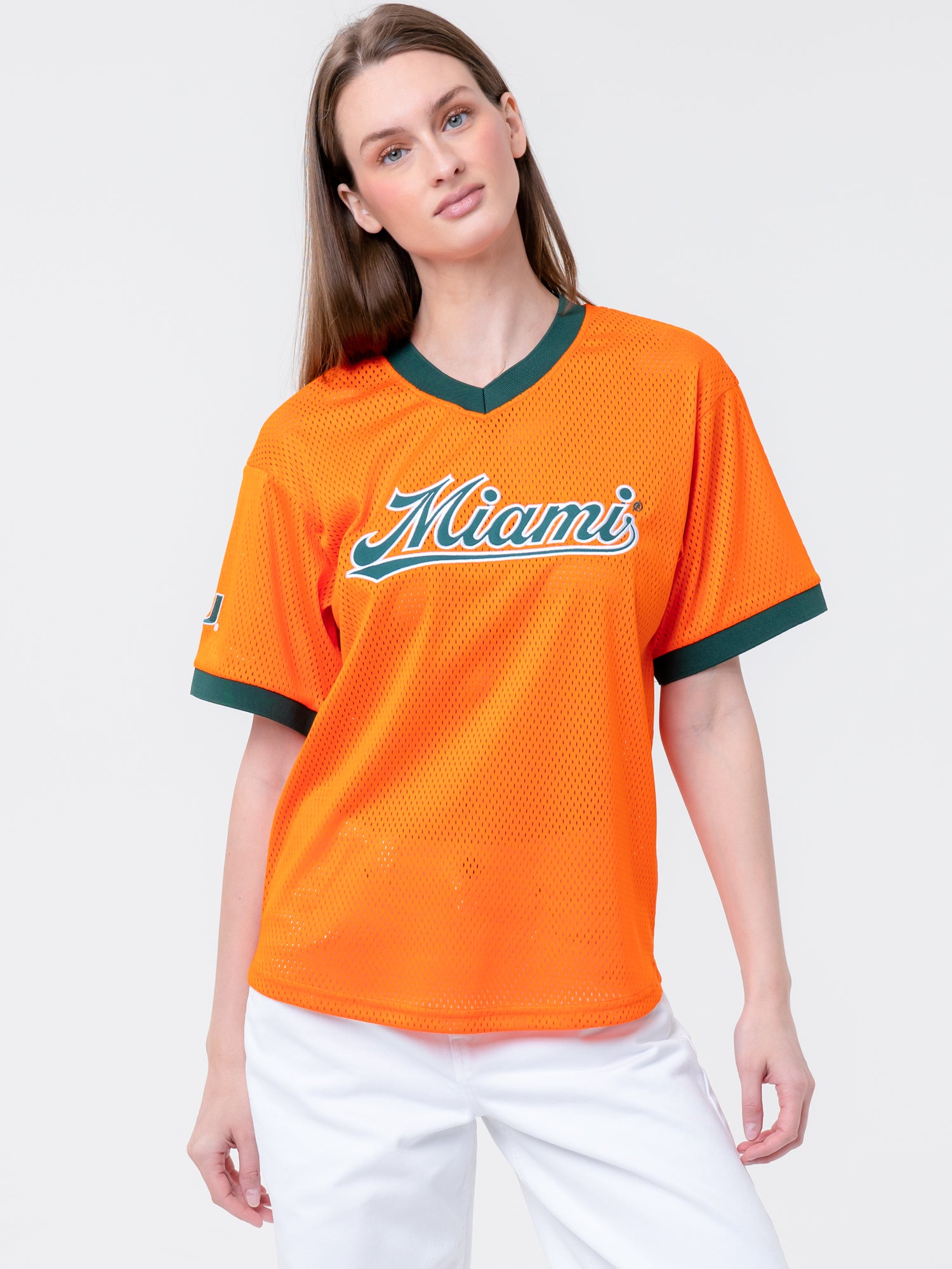 Celebrate game day in bold hurricane style with the University of Miami Full Length Mesh Pullover Jersey by Established & Co. Designed in vibrant orange with tackle twill “Miami”, this jersey brings school spirit to life with a fashion-forward twist. Crafted from lightweight, breathable small-hole mesh, it offers a fit that's perfect for stadium days or layered streetwear looks.