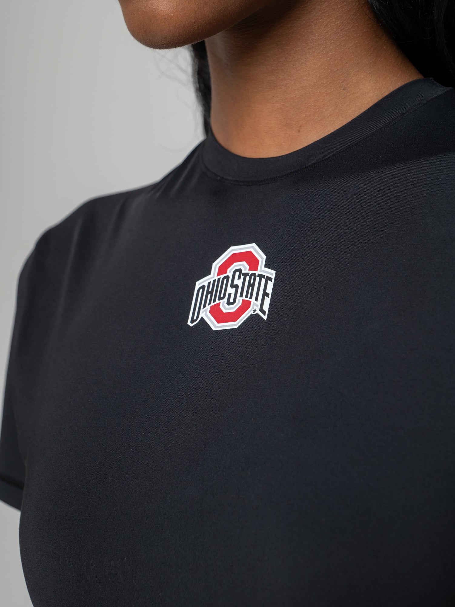 Show your university spirit with the Ohio State University Stadium Triple Threat Tee from Established and Company. Designed with soft form-fitting sleek fabric, highlighting the Ohio logo in university colors. Perfect for Game day! Featuring Ohio State athletic logo.